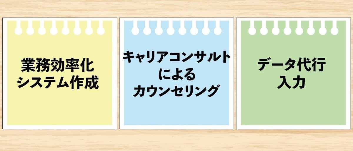 〇 業務効率化へのコンサルティング〇 IT利活用による業務効率化〇 様々なデータ入力の代行〇 VBAシステムの構築支援 このような時にご利用ください!!! 本業に専念できず、事務作業に追われてお客様へのサービスがおろそかになってる 介護職員や世話人が事務作業をしていて、本来の業務ができない 突然に職員が辞めて、総務や人事・経理等に困っている マクロを組んで、日常の業務を簡素化したい またデータ入力など、日々の業務に追われている